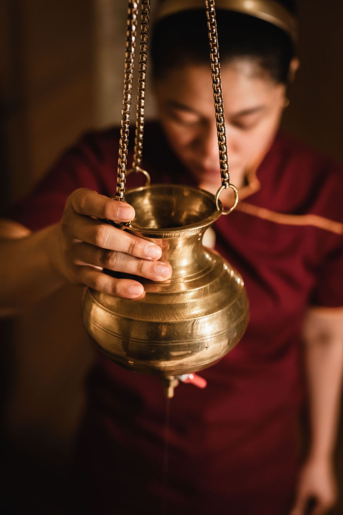 Po masáži Abhyanga následuje samotná Shirodhara – teplý bylinný olej pomalu stékající na čelo v oblasti tzv. „třetího oka“, odkud se jemně rozlévá směrem k temeni hlavy. Nepřetržitý rytmický proud oleje má silně zklidňující účinky, pomáhá uvolnit napětí a navodit stav hluboké relaxace. Součástí terapie je také masáž hlavy a šíje, která účinky celé procedury dále prohlubuje.